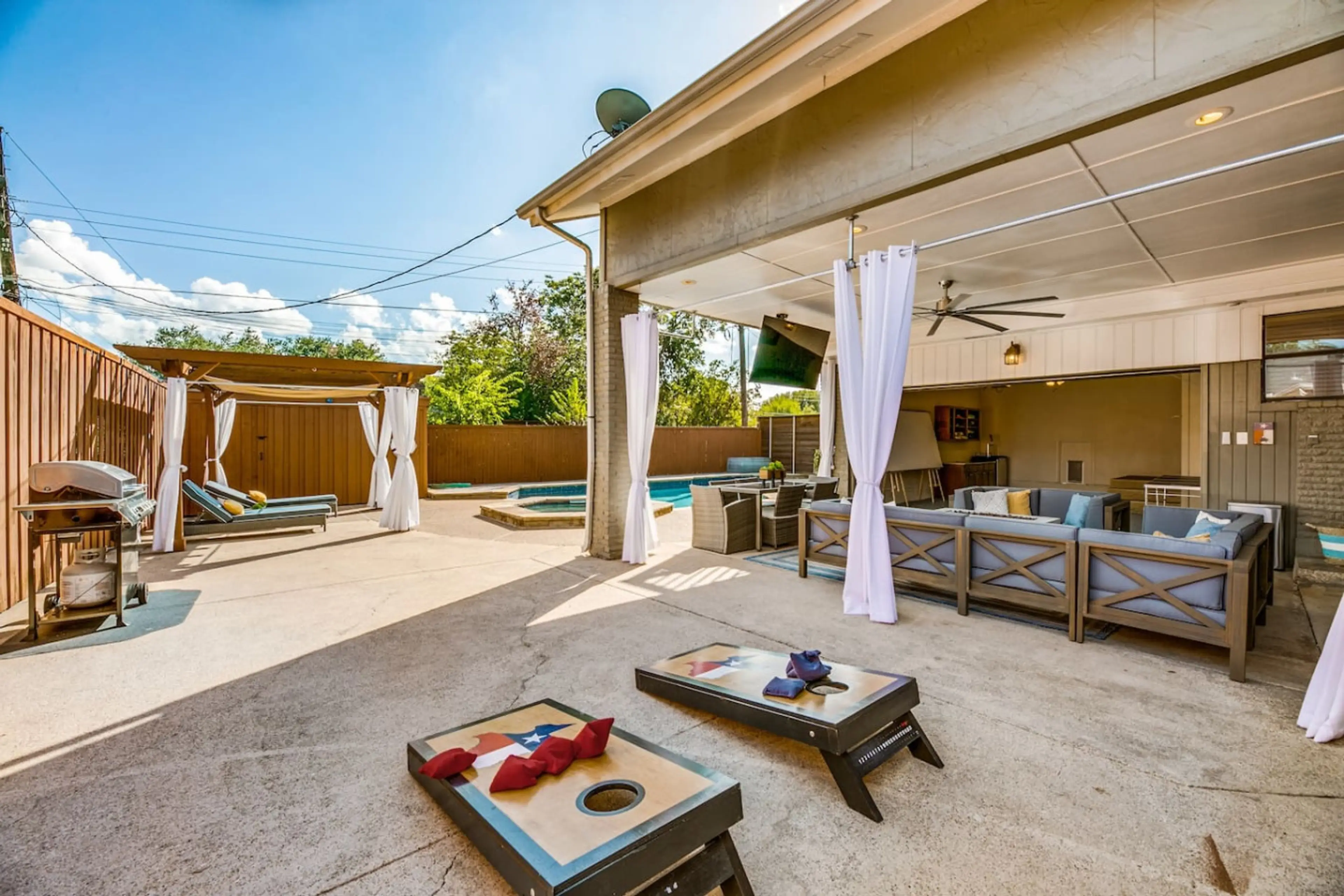 As a Texas-inspired vacation home, this place is all about the outdoor fun! Heated pool, spa, cabana and covered seating area with a fire pit. Perfect for families as it comfortably sleeps everyone in individual beds and features both indoor/outdoor dining areas. Complete with shuffleboard, darts, f...